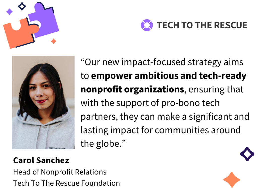 Let’s delve deeper into our new strategic direction with Carol Sanchez, the Head of our Nonprofits Relations Team, who shares insights on the profile of nonprofits we aim to support at Tech To The Rescue.